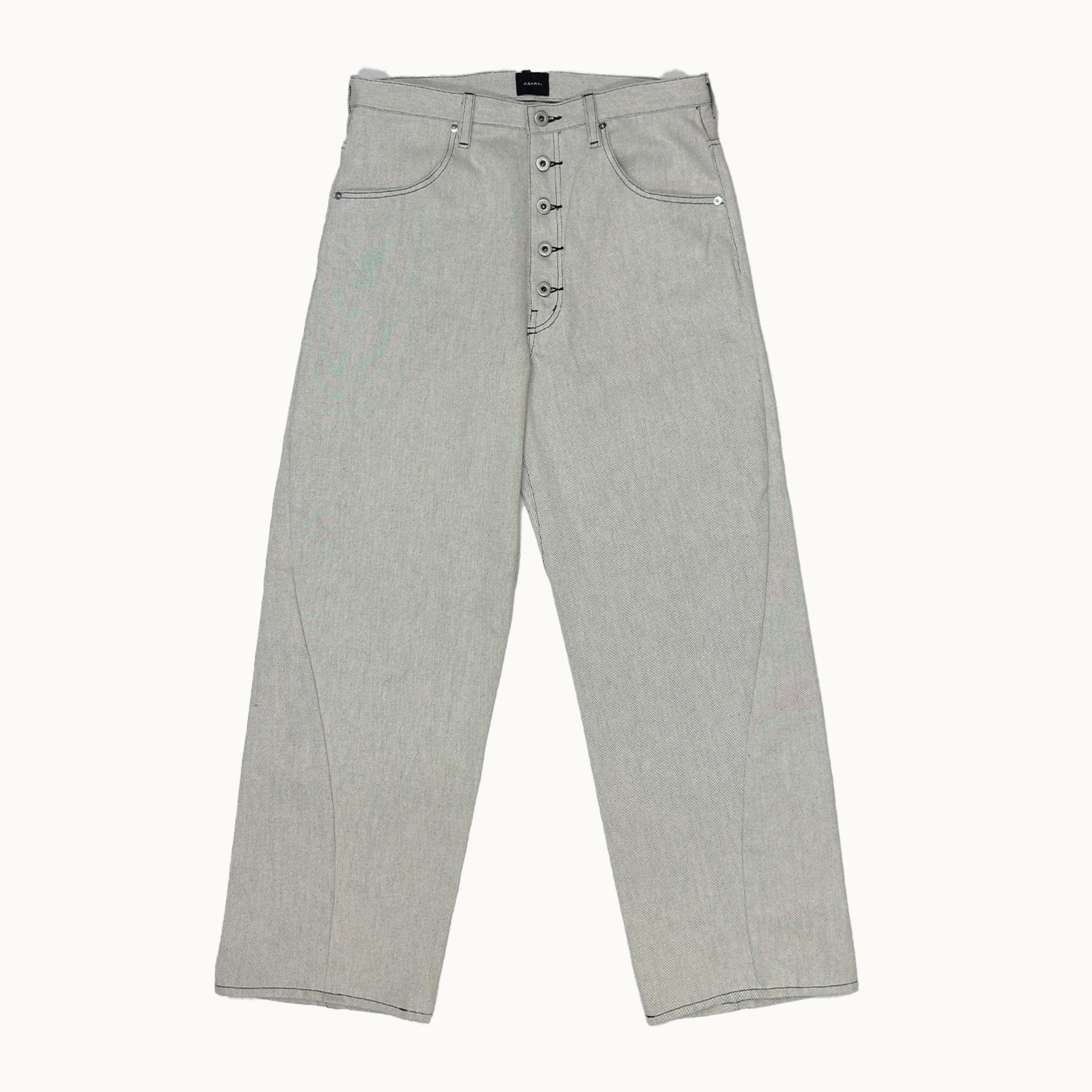 その“切り替わりの不安定さ”を、直線ではなく歪んだ切り替え線としてパンツに落とし込みました。整いすぎないラインが、少しの違和感を感じられる商品です。
